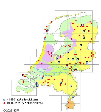 Het aantal atlasblokken (5x5 km) waarin de soort is gemeld binnen een periode van vijf jaar (vanaf 1980) of twintig jaar. Niet gecorrigeerd voor waarnemersinspanning en het aantal doorgegeven waarnemingen kan sterk variëren per periode, dus een trend in verspreiding kan hier niet direct uit worden afgelezen. Het opgegeven jaartal is het eerste jaar van de periode. Bron: gevalideerde waarnemingen uit de NDFF.