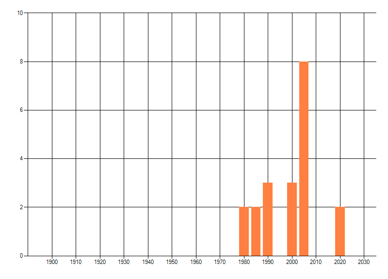 Het aantal atlasblokken (5x5 km) waarin de soort is gemeld binnen een periode van vijf jaar (vanaf 1980) of twintig jaar. Niet gecorrigeerd voor waarnemersinspanning en het aantal doorgegeven waarnemingen kan sterk variëren per periode, dus een trend in verspreiding kan hier niet direct uit worden afgelezen. Het opgegeven jaartal is het eerste jaar van de periode. Bron: gevalideerde waarnemingen uit de NDFF.