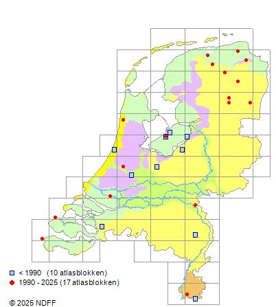 Het aantal atlasblokken (5x5 km) waarin de soort is gemeld binnen een periode van vijf jaar (vanaf 1980) of twintig jaar. Niet gecorrigeerd voor waarnemersinspanning en het aantal doorgegeven waarnemingen kan sterk variëren per periode, dus een trend in verspreiding kan hier niet direct uit worden afgelezen. Het opgegeven jaartal is het eerste jaar van de periode. Bron: gevalideerde waarnemingen uit de NDFF.