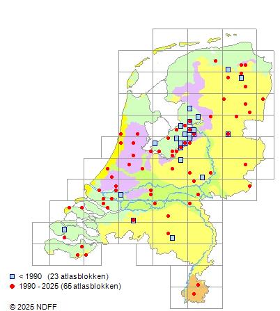 Het aantal atlasblokken (5x5 km) waarin de soort is gemeld binnen een periode van vijf jaar (vanaf 1980) of twintig jaar. Niet gecorrigeerd voor waarnemersinspanning en het aantal doorgegeven waarnemingen kan sterk variëren per periode, dus een trend in verspreiding kan hier niet direct uit worden afgelezen. Het opgegeven jaartal is het eerste jaar van de periode. Bron: gevalideerde waarnemingen uit de NDFF.