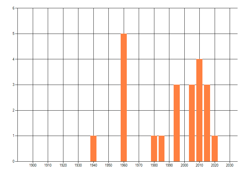 Het aantal atlasblokken (5x5 km) waarin de soort is gemeld binnen een periode van vijf jaar (vanaf 1980) of twintig jaar. Niet gecorrigeerd voor waarnemersinspanning en het aantal doorgegeven waarnemingen kan sterk variëren per periode, dus een trend in verspreiding kan hier niet direct uit worden afgelezen. Het opgegeven jaartal is het eerste jaar van de periode. Bron: gevalideerde waarnemingen uit de NDFF.