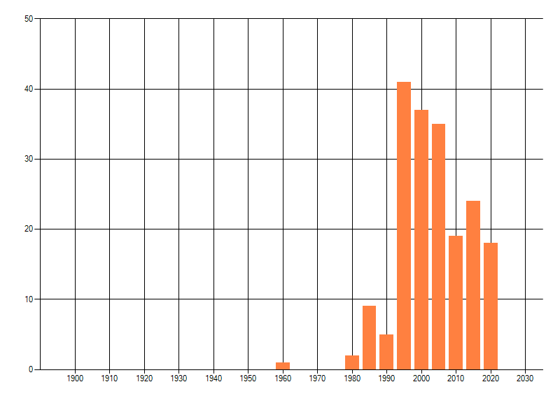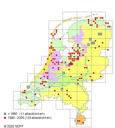 Het aantal atlasblokken (5x5 km) waarin de soort is gemeld binnen een periode van vijf jaar (vanaf 1980) of twintig jaar. Niet gecorrigeerd voor waarnemersinspanning en het aantal doorgegeven waarnemingen kan sterk variëren per periode, dus een trend in verspreiding kan hier niet direct uit worden afgelezen. Het opgegeven jaartal is het eerste jaar van de periode. Bron: gevalideerde waarnemingen uit de NDFF.