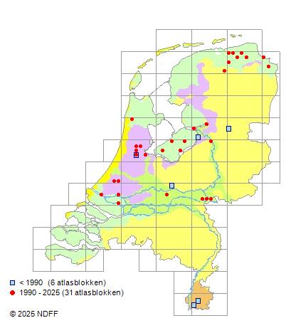 Het aantal atlasblokken (5x5 km) waarin de soort is gemeld binnen een periode van vijf jaar (vanaf 1980) of twintig jaar. Niet gecorrigeerd voor waarnemersinspanning en het aantal doorgegeven waarnemingen kan sterk variëren per periode, dus een trend in verspreiding kan hier niet direct uit worden afgelezen. Het opgegeven jaartal is het eerste jaar van de periode. Bron: gevalideerde waarnemingen uit de NDFF.