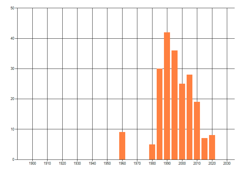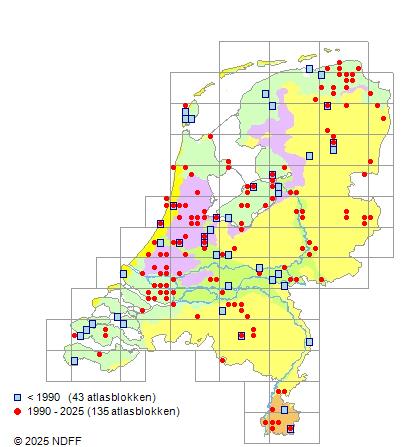 Het aantal atlasblokken (5x5 km) waarin de soort is gemeld binnen een periode van vijf jaar (vanaf 1980) of twintig jaar. Niet gecorrigeerd voor waarnemersinspanning en het aantal doorgegeven waarnemingen kan sterk variëren per periode, dus een trend in verspreiding kan hier niet direct uit worden afgelezen. Het opgegeven jaartal is het eerste jaar van de periode. Bron: gevalideerde waarnemingen uit de NDFF.