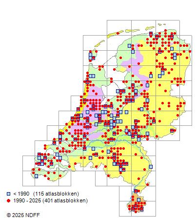 Het aantal atlasblokken (5x5 km) waarin de soort is gemeld binnen een periode van vijf jaar (vanaf 1980) of twintig jaar. Niet gecorrigeerd voor waarnemersinspanning en het aantal doorgegeven waarnemingen kan sterk variëren per periode, dus een trend in verspreiding kan hier niet direct uit worden afgelezen. Het opgegeven jaartal is het eerste jaar van de periode. Bron: gevalideerde waarnemingen uit de NDFF.