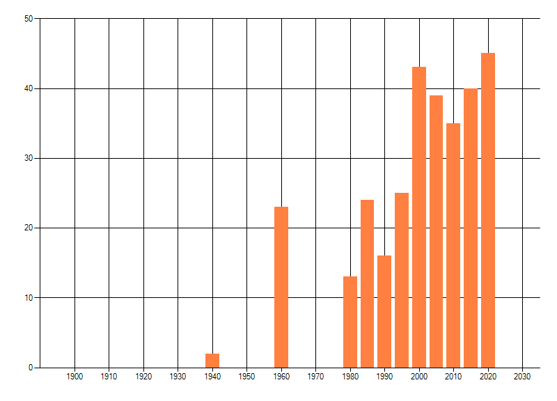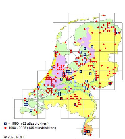 Het aantal atlasblokken (5x5 km) waarin de soort is gemeld binnen een periode van vijf jaar (vanaf 1980) of twintig jaar. Niet gecorrigeerd voor waarnemersinspanning en het aantal doorgegeven waarnemingen kan sterk variëren per periode, dus een trend in verspreiding kan hier niet direct uit worden afgelezen. Het opgegeven jaartal is het eerste jaar van de periode. Bron: gevalideerde waarnemingen uit de NDFF.