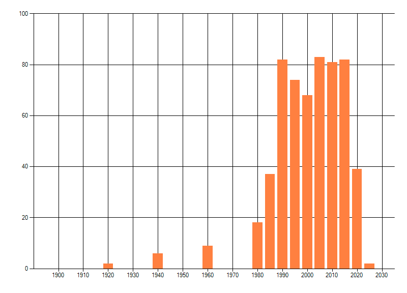 Het aantal atlasblokken (5x5 km) waarin de soort is gemeld binnen een periode van vijf jaar (vanaf 1980) of twintig jaar. Niet gecorrigeerd voor waarnemersinspanning en het aantal doorgegeven waarnemingen kan sterk variëren per periode, dus een trend in verspreiding kan hier niet direct uit worden afgelezen. Het opgegeven jaartal is het eerste jaar van de periode. Bron: gevalideerde waarnemingen uit de NDFF.