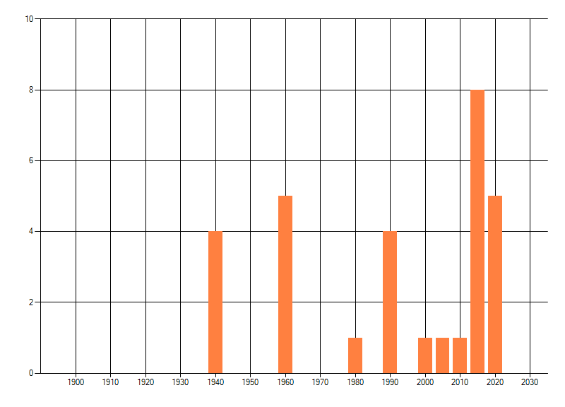 Het aantal atlasblokken (5x5 km) waarin de soort is gemeld binnen een periode van vijf jaar (vanaf 1980) of twintig jaar. Niet gecorrigeerd voor waarnemersinspanning en het aantal doorgegeven waarnemingen kan sterk variëren per periode, dus een trend in verspreiding kan hier niet direct uit worden afgelezen. Het opgegeven jaartal is het eerste jaar van de periode. Bron: gevalideerde waarnemingen uit de NDFF.