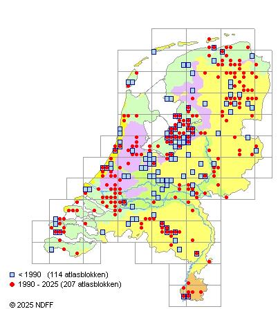 Het aantal atlasblokken (5x5 km) waarin de soort is gemeld binnen een periode van vijf jaar (vanaf 1980) of twintig jaar. Niet gecorrigeerd voor waarnemersinspanning en het aantal doorgegeven waarnemingen kan sterk variëren per periode, dus een trend in verspreiding kan hier niet direct uit worden afgelezen. Het opgegeven jaartal is het eerste jaar van de periode. Bron: gevalideerde waarnemingen uit de NDFF.