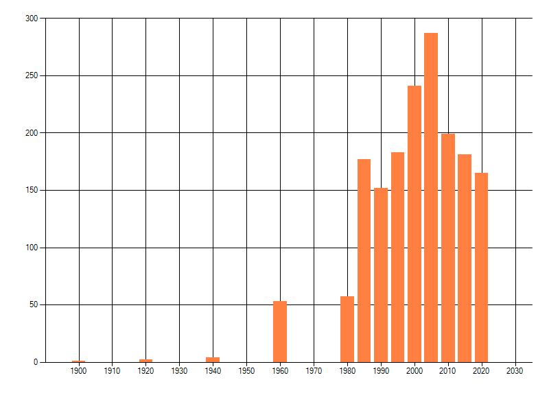 Het aantal atlasblokken (5x5 km) waarin de soort is gemeld binnen een periode van vijf jaar (vanaf 1980) of twintig jaar. Niet gecorrigeerd voor waarnemersinspanning en het aantal doorgegeven waarnemingen kan sterk variëren per periode, dus een trend in verspreiding kan hier niet direct uit worden afgelezen. Het opgegeven jaartal is het eerste jaar van de periode. Bron: gevalideerde waarnemingen uit de NDFF.