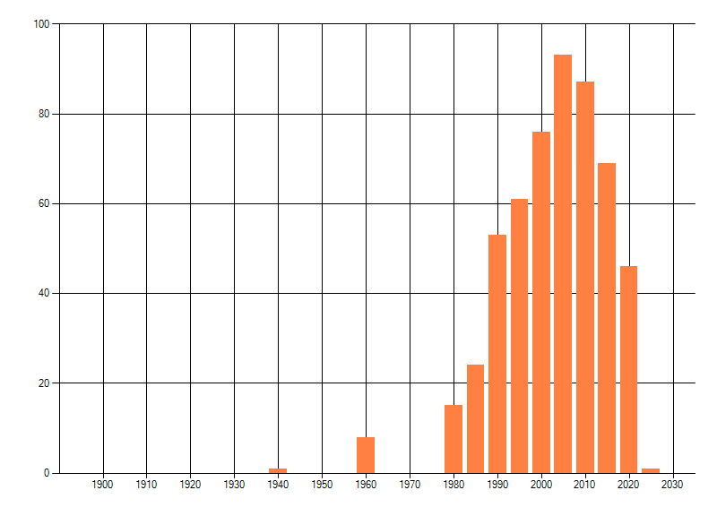 Het aantal atlasblokken (5x5 km) waarin de soort is gemeld binnen een periode van vijf jaar (vanaf 1980) of twintig jaar. Niet gecorrigeerd voor waarnemersinspanning en het aantal doorgegeven waarnemingen kan sterk variëren per periode, dus een trend in verspreiding kan hier niet direct uit worden afgelezen. Het opgegeven jaartal is het eerste jaar van de periode. Bron: gevalideerde waarnemingen uit de NDFF.