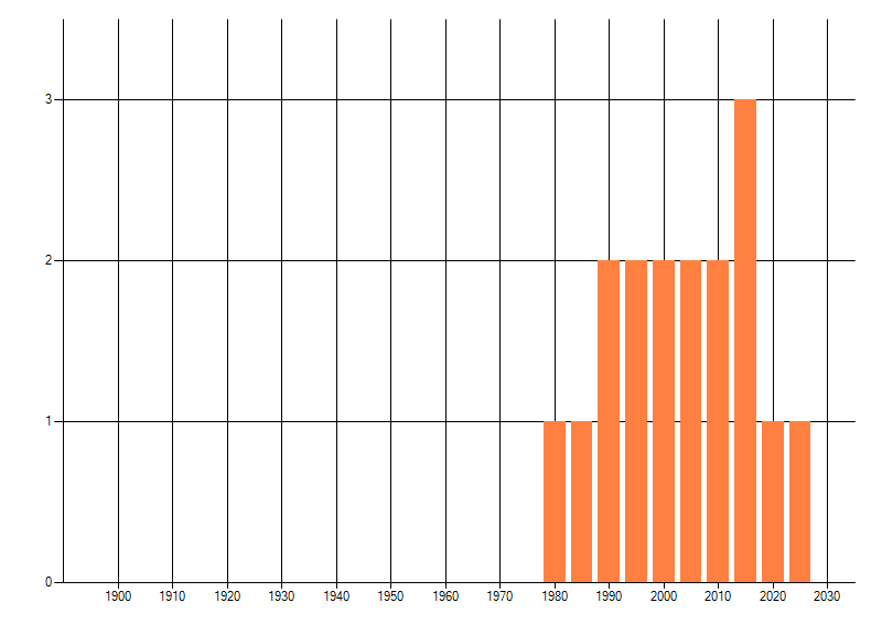 Het aantal atlasblokken (5x5 km) waarin de soort is gemeld binnen een periode van vijf jaar (vanaf 1980) of twintig jaar. Niet gecorrigeerd voor waarnemersinspanning en het aantal doorgegeven waarnemingen kan sterk variëren per periode, dus een trend in verspreiding kan hier niet direct uit worden afgelezen. Het opgegeven jaartal is het eerste jaar van de periode. Bron: gevalideerde waarnemingen uit de NDFF.