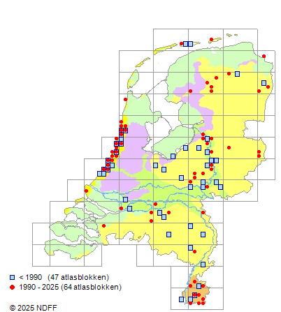Het aantal atlasblokken (5x5 km) waarin de soort is gemeld binnen een periode van vijf jaar (vanaf 1980) of twintig jaar. Niet gecorrigeerd voor waarnemersinspanning en het aantal doorgegeven waarnemingen kan sterk variëren per periode, dus een trend in verspreiding kan hier niet direct uit worden afgelezen. Het opgegeven jaartal is het eerste jaar van de periode. Bron: gevalideerde waarnemingen uit de NDFF.