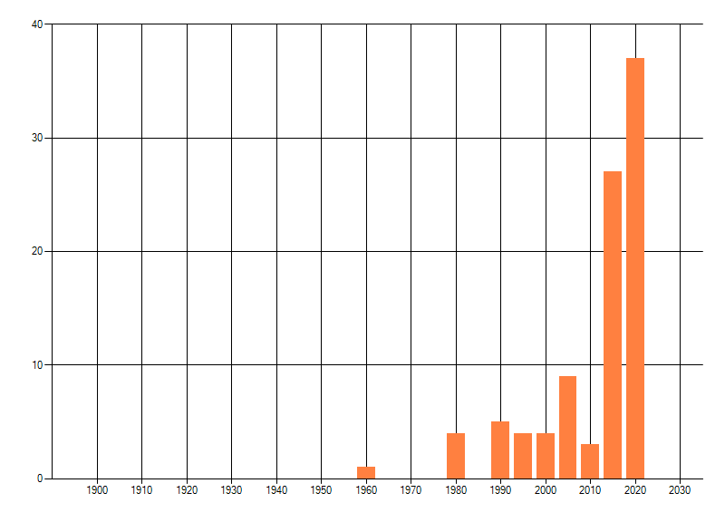 Het aantal atlasblokken (5x5 km) waarin de soort is gemeld binnen een periode van vijf jaar (vanaf 1980) of twintig jaar. Niet gecorrigeerd voor waarnemersinspanning en het aantal doorgegeven waarnemingen kan sterk variëren per periode, dus een trend in verspreiding kan hier niet direct uit worden afgelezen. Het opgegeven jaartal is het eerste jaar van de periode. Bron: gevalideerde waarnemingen uit de NDFF.