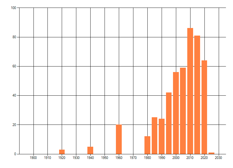 Het aantal atlasblokken (5x5 km) waarin de soort is gemeld binnen een periode van vijf jaar (vanaf 1980) of twintig jaar. Niet gecorrigeerd voor waarnemersinspanning en het aantal doorgegeven waarnemingen kan sterk variëren per periode, dus een trend in verspreiding kan hier niet direct uit worden afgelezen. Het opgegeven jaartal is het eerste jaar van de periode. Bron: gevalideerde waarnemingen uit de NDFF.