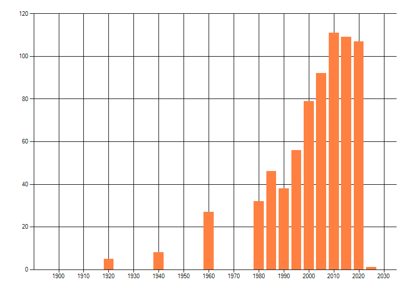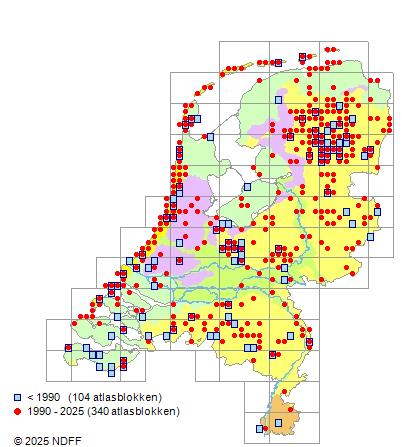 Het aantal atlasblokken (5x5 km) waarin de soort is gemeld binnen een periode van vijf jaar (vanaf 1980) of twintig jaar. Niet gecorrigeerd voor waarnemersinspanning en het aantal doorgegeven waarnemingen kan sterk variëren per periode, dus een trend in verspreiding kan hier niet direct uit worden afgelezen. Het opgegeven jaartal is het eerste jaar van de periode. Bron: gevalideerde waarnemingen uit de NDFF.