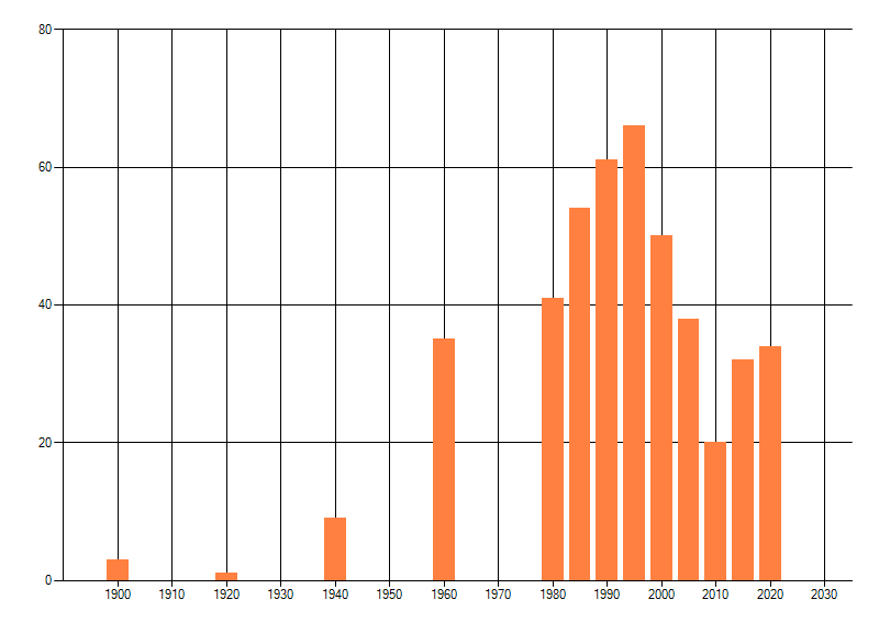 Het aantal atlasblokken (5x5 km) waarin de soort is gemeld binnen een periode van vijf jaar (vanaf 1980) of twintig jaar. Niet gecorrigeerd voor waarnemersinspanning en het aantal doorgegeven waarnemingen kan sterk variëren per periode, dus een trend in verspreiding kan hier niet direct uit worden afgelezen. Het opgegeven jaartal is het eerste jaar van de periode. Bron: gevalideerde waarnemingen uit de NDFF.