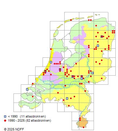 Het aantal atlasblokken (5x5 km) waarin de soort is gemeld binnen een periode van vijf jaar (vanaf 1980) of twintig jaar. Niet gecorrigeerd voor waarnemersinspanning en het aantal doorgegeven waarnemingen kan sterk variëren per periode, dus een trend in verspreiding kan hier niet direct uit worden afgelezen. Het opgegeven jaartal is het eerste jaar van de periode. Bron: gevalideerde waarnemingen uit de NDFF.