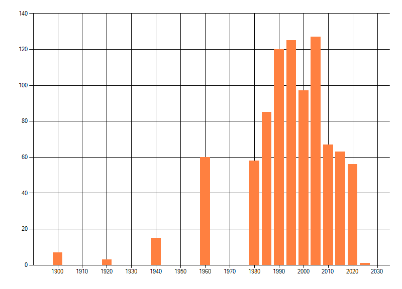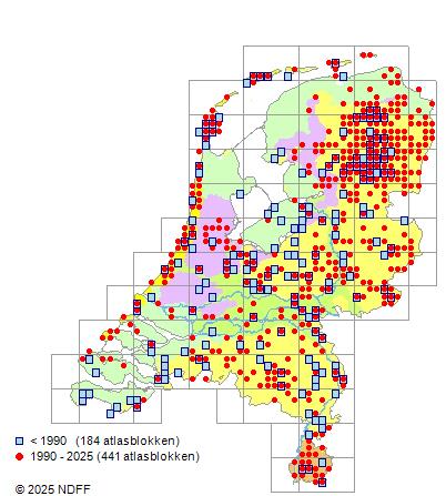 Het aantal atlasblokken (5x5 km) waarin de soort is gemeld binnen een periode van vijf jaar (vanaf 1980) of twintig jaar. Niet gecorrigeerd voor waarnemersinspanning en het aantal doorgegeven waarnemingen kan sterk variëren per periode, dus een trend in verspreiding kan hier niet direct uit worden afgelezen. Het opgegeven jaartal is het eerste jaar van de periode. Bron: gevalideerde waarnemingen uit de NDFF.