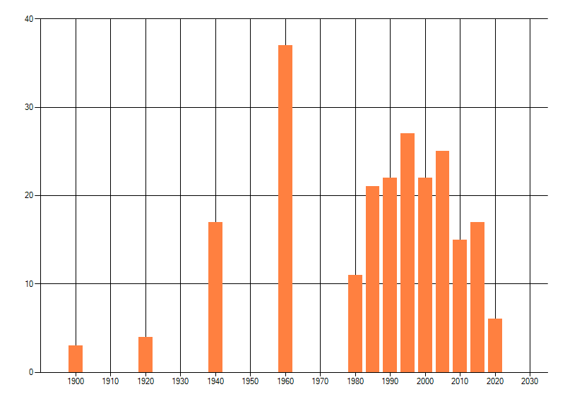 Het aantal atlasblokken (5x5 km) waarin de soort is gemeld binnen een periode van vijf jaar (vanaf 1980) of twintig jaar. Niet gecorrigeerd voor waarnemersinspanning en het aantal doorgegeven waarnemingen kan sterk variëren per periode, dus een trend in verspreiding kan hier niet direct uit worden afgelezen. Het opgegeven jaartal is het eerste jaar van de periode. Bron: gevalideerde waarnemingen uit de NDFF.