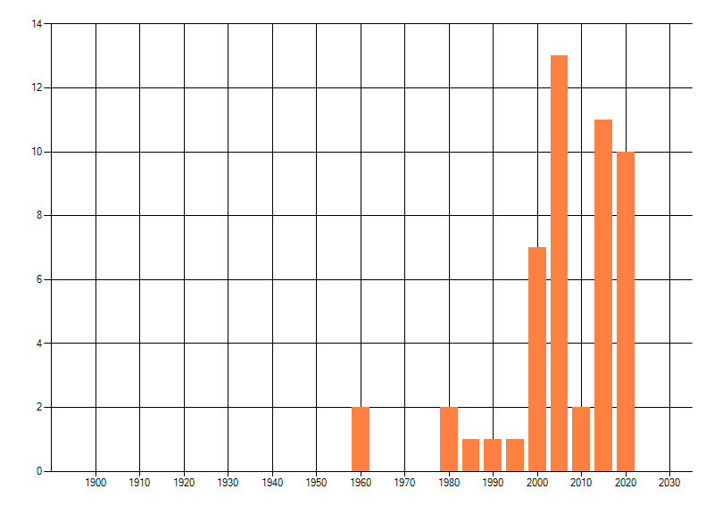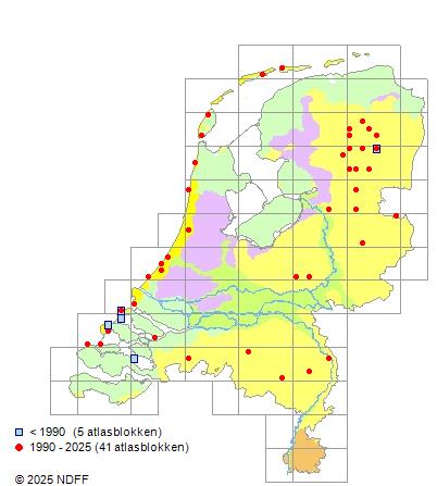 Het aantal atlasblokken (5x5 km) waarin de soort is gemeld binnen een periode van vijf jaar (vanaf 1980) of twintig jaar. Niet gecorrigeerd voor waarnemersinspanning en het aantal doorgegeven waarnemingen kan sterk variëren per periode, dus een trend in verspreiding kan hier niet direct uit worden afgelezen. Het opgegeven jaartal is het eerste jaar van de periode. Bron: gevalideerde waarnemingen uit de NDFF.