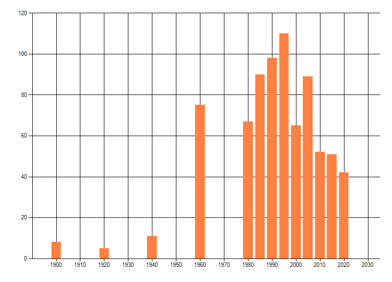 Het aantal atlasblokken (5x5 km) waarin de soort is gemeld binnen een periode van vijf jaar (vanaf 1980) of twintig jaar. Niet gecorrigeerd voor waarnemersinspanning en het aantal doorgegeven waarnemingen kan sterk variëren per periode, dus een trend in verspreiding kan hier niet direct uit worden afgelezen. Het opgegeven jaartal is het eerste jaar van de periode. Bron: gevalideerde waarnemingen uit de NDFF.