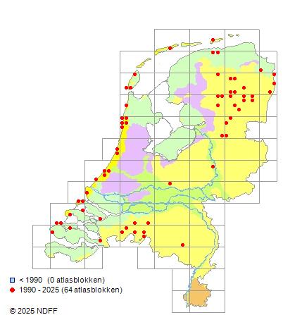 Het aantal atlasblokken (5x5 km) waarin de soort is gemeld binnen een periode van vijf jaar (vanaf 1980) of twintig jaar. Niet gecorrigeerd voor waarnemersinspanning en het aantal doorgegeven waarnemingen kan sterk variëren per periode, dus een trend in verspreiding kan hier niet direct uit worden afgelezen. Het opgegeven jaartal is het eerste jaar van de periode. Bron: gevalideerde waarnemingen uit de NDFF.