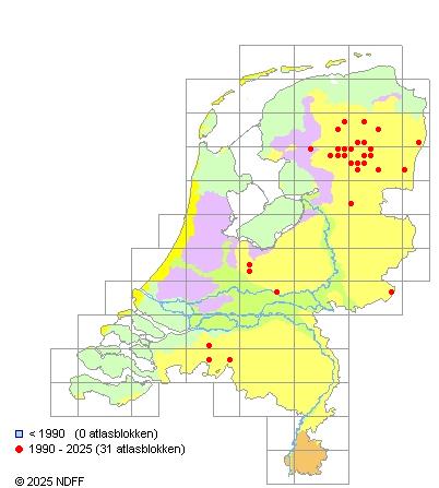 Het aantal atlasblokken (5x5 km) waarin de soort is gemeld binnen een periode van vijf jaar (vanaf 1980) of twintig jaar. Niet gecorrigeerd voor waarnemersinspanning en het aantal doorgegeven waarnemingen kan sterk variëren per periode, dus een trend in verspreiding kan hier niet direct uit worden afgelezen. Het opgegeven jaartal is het eerste jaar van de periode. Bron: gevalideerde waarnemingen uit de NDFF.