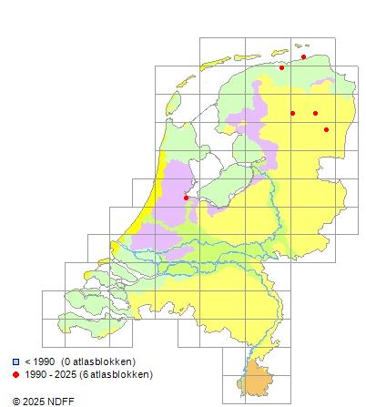 Het aantal atlasblokken (5x5 km) waarin de soort is gemeld binnen een periode van vijf jaar (vanaf 1980) of twintig jaar. Niet gecorrigeerd voor waarnemersinspanning en het aantal doorgegeven waarnemingen kan sterk variëren per periode, dus een trend in verspreiding kan hier niet direct uit worden afgelezen. Het opgegeven jaartal is het eerste jaar van de periode. Bron: gevalideerde waarnemingen uit de NDFF.