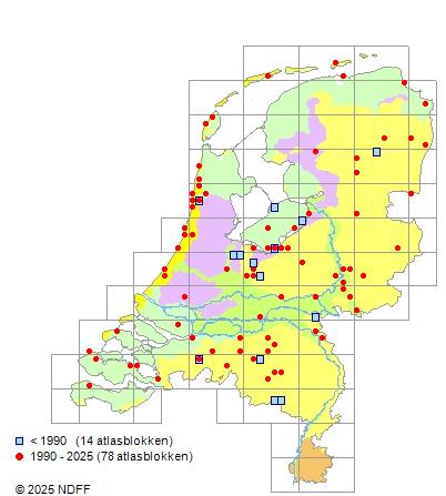 Het aantal atlasblokken (5x5 km) waarin de soort is gemeld binnen een periode van vijf jaar (vanaf 1980) of twintig jaar. Niet gecorrigeerd voor waarnemersinspanning en het aantal doorgegeven waarnemingen kan sterk variëren per periode, dus een trend in verspreiding kan hier niet direct uit worden afgelezen. Het opgegeven jaartal is het eerste jaar van de periode. Bron: gevalideerde waarnemingen uit de NDFF.