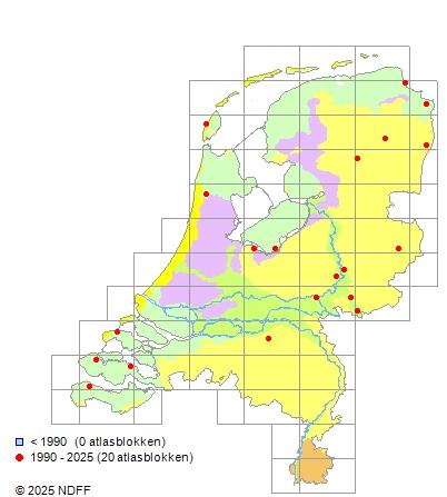 Het aantal atlasblokken (5x5 km) waarin de soort is gemeld binnen een periode van vijf jaar (vanaf 1980) of twintig jaar. Niet gecorrigeerd voor waarnemersinspanning en het aantal doorgegeven waarnemingen kan sterk variëren per periode, dus een trend in verspreiding kan hier niet direct uit worden afgelezen. Het opgegeven jaartal is het eerste jaar van de periode. Bron: gevalideerde waarnemingen uit de NDFF.