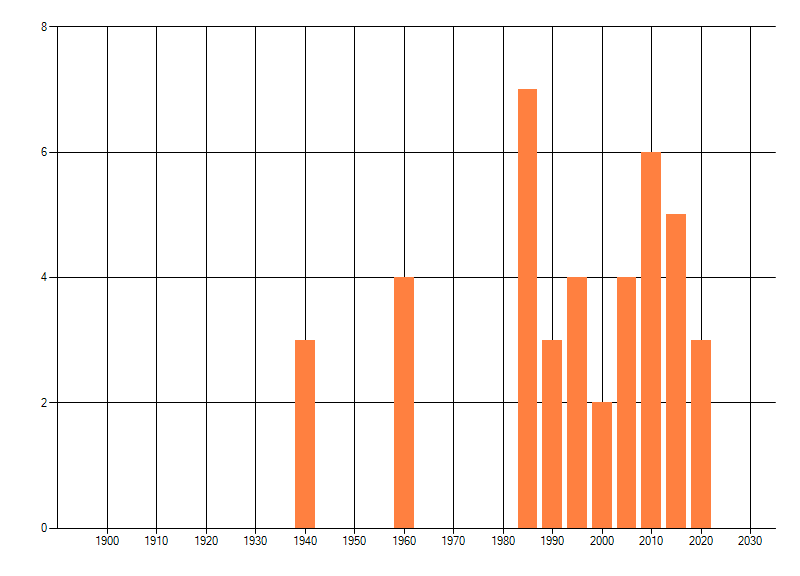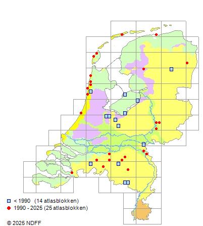 Het aantal atlasblokken (5x5 km) waarin de soort is gemeld binnen een periode van vijf jaar (vanaf 1980) of twintig jaar. Niet gecorrigeerd voor waarnemersinspanning en het aantal doorgegeven waarnemingen kan sterk variëren per periode, dus een trend in verspreiding kan hier niet direct uit worden afgelezen. Het opgegeven jaartal is het eerste jaar van de periode. Bron: gevalideerde waarnemingen uit de NDFF.