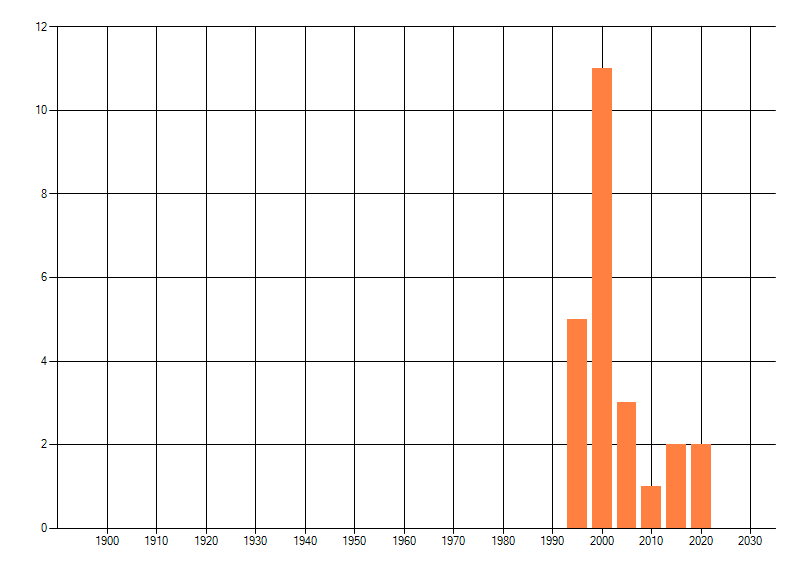 Het aantal atlasblokken (5x5 km) waarin de soort is gemeld binnen een periode van vijf jaar (vanaf 1980) of twintig jaar. Niet gecorrigeerd voor waarnemersinspanning en het aantal doorgegeven waarnemingen kan sterk variëren per periode, dus een trend in verspreiding kan hier niet direct uit worden afgelezen. Het opgegeven jaartal is het eerste jaar van de periode. Bron: gevalideerde waarnemingen uit de NDFF.