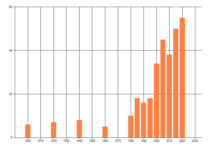 Het aantal atlasblokken (5x5 km) waarin de soort is gemeld binnen een periode van vijf jaar (vanaf 1980) of twintig jaar. Niet gecorrigeerd voor waarnemersinspanning en het aantal doorgegeven waarnemingen kan sterk variëren per periode, dus een trend in verspreiding kan hier niet direct uit worden afgelezen. Het opgegeven jaartal is het eerste jaar van de periode. Bron: gevalideerde waarnemingen uit de NDFF.