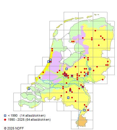 Het aantal atlasblokken (5x5 km) waarin de soort is gemeld binnen een periode van vijf jaar (vanaf 1980) of twintig jaar. Niet gecorrigeerd voor waarnemersinspanning en het aantal doorgegeven waarnemingen kan sterk variëren per periode, dus een trend in verspreiding kan hier niet direct uit worden afgelezen. Het opgegeven jaartal is het eerste jaar van de periode. Bron: gevalideerde waarnemingen uit de NDFF.