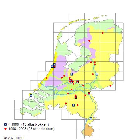 Het aantal atlasblokken (5x5 km) waarin de soort is gemeld binnen een periode van vijf jaar (vanaf 1980) of twintig jaar. Niet gecorrigeerd voor waarnemersinspanning en het aantal doorgegeven waarnemingen kan sterk variëren per periode, dus een trend in verspreiding kan hier niet direct uit worden afgelezen. Het opgegeven jaartal is het eerste jaar van de periode. Bron: gevalideerde waarnemingen uit de NDFF.