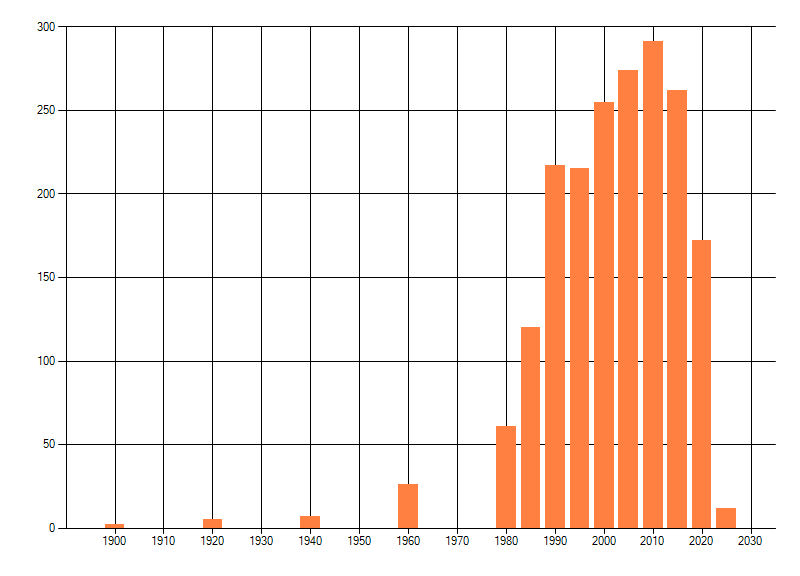 Het aantal atlasblokken (5x5 km) waarin de soort is gemeld binnen een periode van vijf jaar (vanaf 1980) of twintig jaar. Niet gecorrigeerd voor waarnemersinspanning en het aantal doorgegeven waarnemingen kan sterk variëren per periode, dus een trend in verspreiding kan hier niet direct uit worden afgelezen. Het opgegeven jaartal is het eerste jaar van de periode. Bron: gevalideerde waarnemingen uit de NDFF.