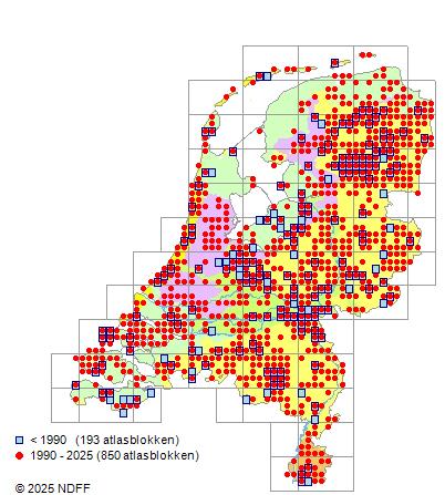 Het aantal atlasblokken (5x5 km) waarin de soort is gemeld binnen een periode van vijf jaar (vanaf 1980) of twintig jaar. Niet gecorrigeerd voor waarnemersinspanning en het aantal doorgegeven waarnemingen kan sterk variƫren per periode, dus een trend in verspreiding kan hier niet direct uit worden afgelezen. Het opgegeven jaartal is het eerste jaar van de periode. Bron: gevalideerde waarnemingen uit de NDFF.