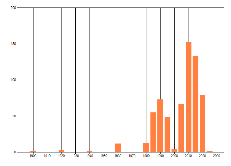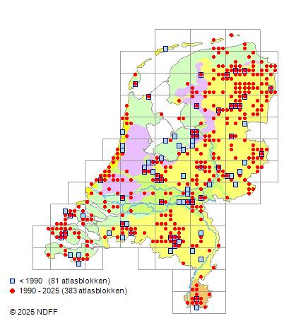 Het aantal atlasblokken (5x5 km) waarin de soort is gemeld binnen een periode van vijf jaar (vanaf 1980) of twintig jaar. Niet gecorrigeerd voor waarnemersinspanning en het aantal doorgegeven waarnemingen kan sterk variëren per periode, dus een trend in verspreiding kan hier niet direct uit worden afgelezen. Het opgegeven jaartal is het eerste jaar van de periode. Bron: gevalideerde waarnemingen uit de NDFF.