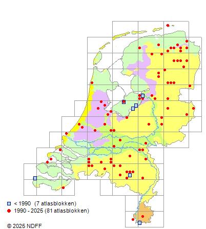 Het aantal atlasblokken (5x5 km) waarin de soort is gemeld binnen een periode van vijf jaar (vanaf 1980) of twintig jaar. Niet gecorrigeerd voor waarnemersinspanning en het aantal doorgegeven waarnemingen kan sterk variëren per periode, dus een trend in verspreiding kan hier niet direct uit worden afgelezen. Het opgegeven jaartal is het eerste jaar van de periode. Bron: gevalideerde waarnemingen uit de NDFF.
