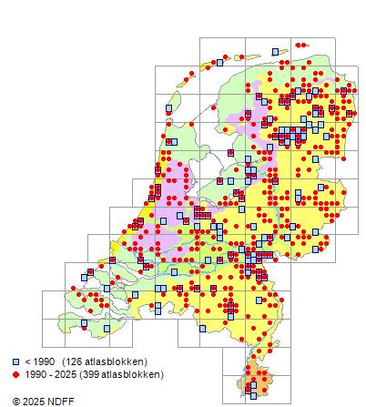 Het aantal atlasblokken (5x5 km) waarin de soort is gemeld binnen een periode van vijf jaar (vanaf 1980) of twintig jaar. Niet gecorrigeerd voor waarnemersinspanning en het aantal doorgegeven waarnemingen kan sterk variëren per periode, dus een trend in verspreiding kan hier niet direct uit worden afgelezen. Het opgegeven jaartal is het eerste jaar van de periode. Bron: gevalideerde waarnemingen uit de NDFF.