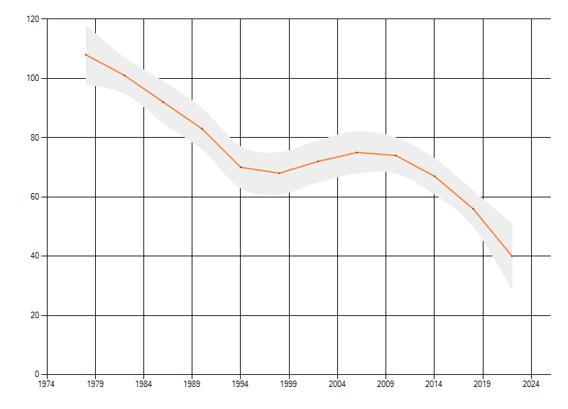 Gemiddelde trend van het aantal kilometerhokken waarin de soort voorkomt, weergegeven als indexcijfer (1975-1978 = 100). De trend is gecorrigeerd voor waarnemersinspanning en geeft de relatieve verandering in het aantal bezette kilometerhokken weer. Voor de berekening worden de data per periode van vier jaar samengenomen. In de grafiek correspondeert ieder punt met het laatste jaar van zo'n periode.
