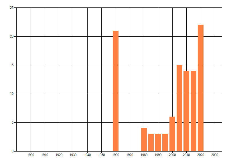 Het aantal atlasblokken (5x5 km) waarin de soort is gemeld binnen een periode van vijf jaar (vanaf 1980) of twintig jaar. Niet gecorrigeerd voor waarnemersinspanning en het aantal doorgegeven waarnemingen kan sterk variëren per periode, dus een trend in verspreiding kan hier niet direct uit worden afgelezen. Het opgegeven jaartal is het eerste jaar van de periode. Bron: gevalideerde waarnemingen uit de NDFF.