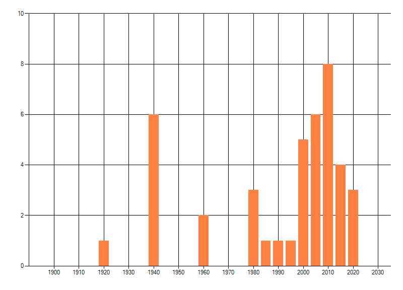 Het aantal atlasblokken (5x5 km) waarin de soort is gemeld binnen een periode van vijf jaar (vanaf 1980) of twintig jaar. Niet gecorrigeerd voor waarnemersinspanning en het aantal doorgegeven waarnemingen kan sterk variëren per periode, dus een trend in verspreiding kan hier niet direct uit worden afgelezen. Het opgegeven jaartal is het eerste jaar van de periode. Bron: gevalideerde waarnemingen uit de NDFF.