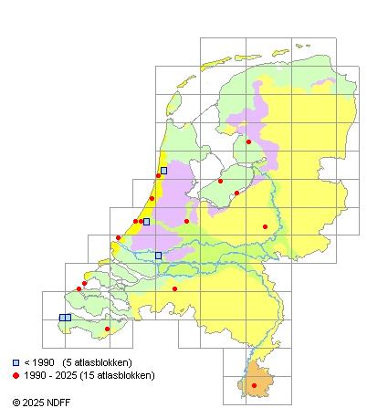 Het aantal atlasblokken (5x5 km) waarin de soort is gemeld binnen een periode van vijf jaar (vanaf 1980) of twintig jaar. Niet gecorrigeerd voor waarnemersinspanning en het aantal doorgegeven waarnemingen kan sterk variëren per periode, dus een trend in verspreiding kan hier niet direct uit worden afgelezen. Het opgegeven jaartal is het eerste jaar van de periode. Bron: gevalideerde waarnemingen uit de NDFF.