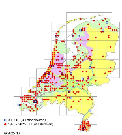 Het aantal atlasblokken (5x5 km) waarin de soort is gemeld binnen een periode van vijf jaar (vanaf 1980) of twintig jaar. Niet gecorrigeerd voor waarnemersinspanning en het aantal doorgegeven waarnemingen kan sterk variëren per periode, dus een trend in verspreiding kan hier niet direct uit worden afgelezen. Het opgegeven jaartal is het eerste jaar van de periode. Bron: gevalideerde waarnemingen uit de NDFF.