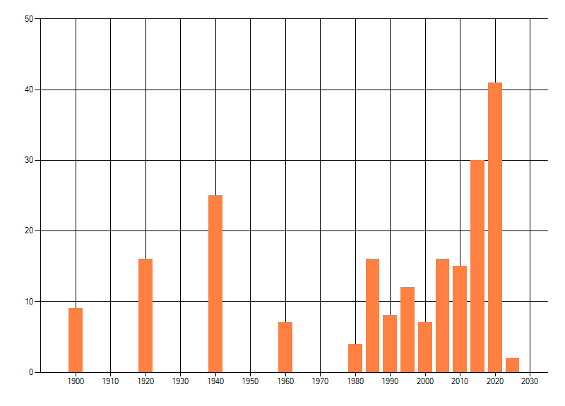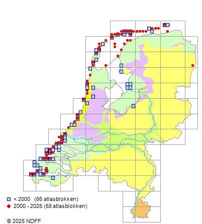 Het aantal atlasblokken (5x5 km) waarin de soort is gemeld binnen een periode van vijf jaar (vanaf 1980) of twintig jaar. Niet gecorrigeerd voor waarnemersinspanning en het aantal doorgegeven waarnemingen kan sterk variëren per periode, dus een trend in verspreiding kan hier niet direct uit worden afgelezen. Het opgegeven jaartal is het eerste jaar van de periode. Bron: gevalideerde waarnemingen uit de NDFF.