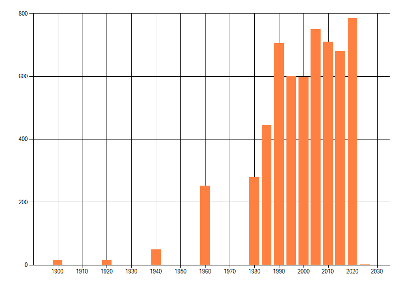 Het aantal atlasblokken (5x5 km) waarin de soort is gemeld binnen een periode van vijf jaar (vanaf 1980) of twintig jaar. Niet gecorrigeerd voor waarnemersinspanning en het aantal doorgegeven waarnemingen kan sterk variëren per periode, dus een trend in verspreiding kan hier niet direct uit worden afgelezen. Het opgegeven jaartal is het eerste jaar van de periode. Bron: gevalideerde waarnemingen uit de NDFF.