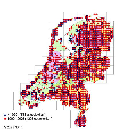 Het aantal atlasblokken (5x5 km) waarin de soort is gemeld binnen een periode van vijf jaar (vanaf 1980) of twintig jaar. Niet gecorrigeerd voor waarnemersinspanning en het aantal doorgegeven waarnemingen kan sterk variëren per periode, dus een trend in verspreiding kan hier niet direct uit worden afgelezen. Het opgegeven jaartal is het eerste jaar van de periode. Bron: gevalideerde waarnemingen uit de NDFF.