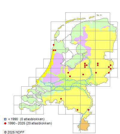 Het aantal atlasblokken (5x5 km) waarin de soort is gemeld binnen een periode van vijf jaar (vanaf 1980) of twintig jaar. Niet gecorrigeerd voor waarnemersinspanning en het aantal doorgegeven waarnemingen kan sterk variëren per periode, dus een trend in verspreiding kan hier niet direct uit worden afgelezen. Het opgegeven jaartal is het eerste jaar van de periode. Bron: gevalideerde waarnemingen uit de NDFF.